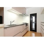 大人かわいい淡いピンクのキッチン。