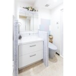 手狭間であった洗面室・トイレは、壁をできるだけなくして、ホテルのように空間をまとめてコンパクトにしました。以前より掃除もしやすくなり、家事の負担が軽減できました。トイレと洗面台は、腰高の壁で空間を分けました。素材は、掃除がしやすいキッチンパネルを使いました。トイレの背面は、アクセントに消臭・調湿効果のあるタイル「エコカラット」を貼りました。