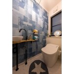 LDKの中央のダイニング・キッチン空間の天井や床の柄を変えて存在感を出したり、各扉のデザインや配色、照明・室内窓やキッチン腰壁に古材を活用したりなど、LDKの360°どこを見渡してもかっこいい空間になるように工夫しました。 モザイクタイルで波を表現したところも拘りです。 キッチン背面には魅せる収納としてカウンターだけ設け、食器棚や食材ストックなどは奥のパントリーにしまうことで、メリハリのある使い方ができるようになっています。 ウォークインクローゼットは、お洒落な服・小物をたくさん持ってみえるご家族様がショップのようなイメージで使っていただけるよう広めの空間にしました。 トイレもLDKから直接アクセスできますが、出てきた人とソファーに座っている人との目が合わないよう、手前の壁にチェッカーガラスを組み込みました。