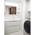 収納たっぷりでリネンやストック品も入るキャビネットに、小物の収納に便利なサイドキャビネットも合わせました。お気に入りアイテムをディスプレイして見せる収納も楽しめます。ホワイトでまとめ、明るく清潔感のあるスッキリとした洗面空間に変わりました。