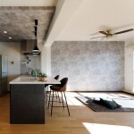 キッチンはお施主様のご要望通り、タカラスタンダードの「トレーシア」を採用。 壁紙もキッチンや照明と調和するよう提案しました。 LDKのアクセントクロスとキッチン天井を同じ壁紙で仕上げ、大変気に入っていただけました。 キッチンのペンダントライトもブラックにし、LDKのアクセントになりました。 また、シーリングファンがお部屋の雰囲気を引き立てています。 床材は朝日ウッドテックの「ネダレス145」の挽板を採用。 妥協をせず、こだわり抜いたリノベーションです。