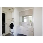 洗面室はオープンな空間にし、脱衣室・浴室と独立させました。左側の扉の奥が脱衣室と浴室、右側がトイレになります。既製品の洗面台はイメージと合うデザインが見つからなかったので、AICAのカウンターと面材と組み合わせて、造作しました。扉は、枠のないデザインの建具を選定。天井高に合わせたオーダーメイドにしました。周囲の壁はタイルで仕上げています。玄関からの動線が近く、帰宅時にすぐに手が洗えたり、来客の方も気兼ねなく使っていただけたりと、利便性がアップしました。