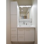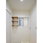 洗面所は狭くて収納が少なかったので、洗面台を大きくして収納量を増やしました。洗濯機スペースの横には造作で可動棚も設置して、何かと増える洗面所の小物や洗剤も置けるスペースに。