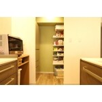 キッチンの床は清掃性に優れる塩ビタイルを張っています。
