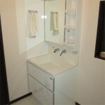 窓をサイズダウンさせて、壁を作り収納力のある洗面台を設置する事で、すっきりとさせる事が可能に、今までの使い勝手もある為、あえて収納の一部は隠れないタイプを採用しました。