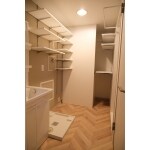 取り除けないのであれば、パネルで隠してしまえ!とホワイトのパネルを設置。将来的に修理・交換も考えて、取り外ししやすいように、天井・床に固定している。 可動棚は洗濯機も見据えた状況での段数にて。 床はヘリンボーン柄のクッションフロアで可愛らしいナチュラルテイストに。