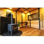 物置部屋が暖炉を設置し、杉板で壁、天井を仕上げました。見せ柱を黒で塗装しており空間が引き締まりました。 暖炉部屋からキッチン、脱衣場と窓を開けると3部屋暖かくなりました。