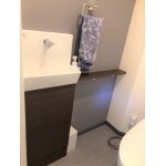 施工前と同様にタンクレスですが、デザインが変わるだけでとてもすっきりとして見えます。 床にダーク色をお選びいただいたことで、空間全体も引き締まりましたし、給水配管が目立ちすぎず馴染んでいました。