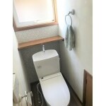 便器はTOTOのピュアレストQRを採用。 ウォシュレットはTOTOの「きれい除菌水」で自動で洗浄・除菌します。 また、お施主様ご自身で購入されたタオルリングとペーパーホルダーを弊社で取付しました。 壁は、背面と両サイドでクロスのデザインを変えたのが、奥様のこだわりです。