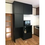 造作家具なので、天井までのサイズもぴったりの無駄の無いキッチン収納ができあがりました。色は元々のクリナップのセントロのカタログに載っていた色を参考に選定しました。奥さまにご満足頂けて何よりでした。