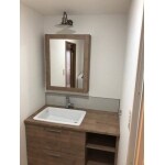 T社の「ドレーナ」を設置いたしました。 木目調キャビネット・フレームで木の質感やぬくもりを感じさせるデザインになっています。 アクセントパネルにはモザイクタイル調グレーを使用し、空間のポイント&お手入れしやすくなっています。