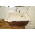 洗面化粧台取り替え、床は丈夫な長尺シート仕上げに