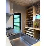 システムキッチンと背面に造作可動棚を設置して家電、食器、ゴミ箱等が収まる仕様にしてあります。