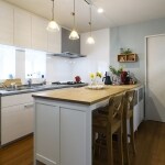 二人暮らしのライフスタイルに合わせて、ワンサイズ小さめのキッチンをセレクト。 西日が強く入り込む窓は、一部をつぶしてキッチンパネルを入れました。