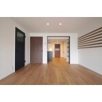 元々お施主様のお母様が入居されていたが、ご夫婦と同居される事をきっかけに、バリアフリーを混じえたリノベーションを行いました。 今回はバリアフリー仕様ということもあり、サニタリーとお手洗いと浴室が同じ空間になっています。 もちろん手すりの設置や、洗面部分は車いすの方でもストレスなく使用できる仕様にしています。 また床が傷つかないようにフロアタイルに目地棒を使っていて、見た目はタイルそのもの。細かいところに気を遣いながらも空間としても、落ち着きのある空間に生まれ変わりました。 次にご自宅の建具は、開口幅を十分に確保して車いすが通れる設計となっています。大きな建具を開けると広いLDKが現れます。非常に開放てきで気持ちのいい空間です。
