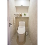 茶色の棚が圧迫感があり、狭いトイレをより狭くしています。