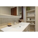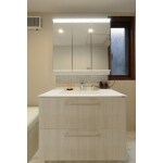 色の統一感、お掃除も楽にとご要望がありました。床はタイル張りからフローリングへ。大建のハピアフロア鏡面調石目柄(ビアンコ柄)です。白をベースとした清潔感ある落ち着いた雰囲気になりました。 全体的に収納スペースも増え収納力もアップしています。