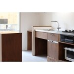キッチンやカップボード、棚板のほとんどをシナ合板+オスモ塗装で作っています。