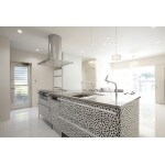 ・幅2,590の大きいアイランド型+背面収納のキッチンを狭い空間に置くと、圧迫感があるので、二間続きの和室をワンルームにして、一番奥にキッチンを配置しました。 ダルメシアン柄キッチンが映えるような照明や、インテリア、収納スペースの確保に気を配りました。 ・当初、寝室は独立させてベッドを置かれる予定でしたが、お子様が小さいこともあり、自由に動き回れる広い空間があったほうがいいと考え、増築部分をフリースペースにして、昼はプレイルーム、夜は布団を敷いて寝室に使えるように、引き戸で仕切れるような提案をさせていただきました。 ・アイランド型のキッチンなので、どこからでも作業できるように、まわりのスペースもできるだけ確保しました。 冷蔵庫や家電収納は、仕切り壁の陰に置き、LDKから見えにくくなる工夫をしています。 冷蔵庫の後ろに30cmほどのスペースがあったので、キッチン側に引き出すスライド収納をつけました。
