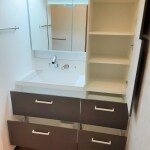 化粧台上部に吊戸棚を設置し、余分なスペースを活用する事が出来ました。 しかし高い位置に棚があるので奥様は手が届きにくい、という事も考えられたので棚が下に降りてくるダウン機構付きのものにしました。 強い力が不要で調整も可能なので使う方に合わせてご使用出来ます。