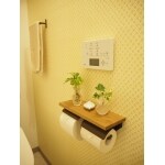 既存の形状はそのままで、レモンイエローのペイント風デザインがさわやかな輸入クロスをアクセントに貼り、暗くなりがちなトイレ空間を明るく演出。