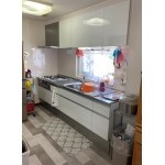 白を基調としたキッチンに暖かい雰囲気の薄いピンク色のキッチンパネルを合わせて施工させて頂きました。