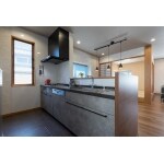 既存の同じ壁付け対面I型の使い勝手はそのままに、吊戸棚を無くし、照明をダウンライトとライティングレールに変えてすっきりとさせました。 キッチンはクリナップのステディア。 ロッシュグレーの扉カラーと、ワークトップは流れ模様が美しいコーリアンのフォレノワールで、クールな印象に。