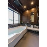サポートバー&シェルフや足ピタフロアでユニバーサル仕様のクリナップのアクリアバス。ご家族全員が安心して入浴できます。多彩な空間を表現できる腰壁デザインの壁パネルが、リビングにいるような温かみのある空間を演出します。