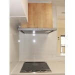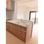 キッチン、フローリングを明るめにしました。 シンク上の吊戸棚をなくし、背面収納を設置しました。