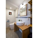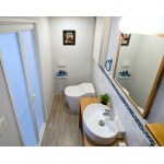トイレのドアもないので、広い空間になりました。アクセントに壁をタイル貼り、レストルーム、洗面がとてもお洒落になりました。