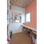 2階のファミリールームに面した場所に奥様の書斎を設計しました。入口の引き戸を閉じれば、プライベートな空間にすることもできます。 奥様がひとりの時間をゆっくりと満喫できるよう、大好きなミッフィーのクロスやカラーで内装をコーディネート。壁のニッチ収納には、小物や本を飾ることができます。 カウンターと収納もしっかりと設けました。