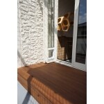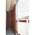 猫ちゃんの落下防止のため、既存手すり上から庇のない天井までまるごとフェンスで囲み、陸屋根にもでられる様に一部開閉式としました。ガーデニングがお好きと伺っていましたので目隠しには草花にもマッチした天然木ウリンで縦格子を造作。また手すり上下のすき間もウリン材で埋めてます。