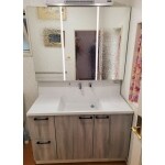 ぴったり納まる特殊サイズのタカラスタンダード リジャストを採用しました。 特殊サイズの間口でも1cmピッチのキャビネットやミラーでスキマを埋める造作材やフィラーなどを使用することなく、ぴったり納まります。 水はねをガードし背面までが一体となったハイバックカウンターにエコタイプのセンサーシングルレバー式シャワー水栓をお選びいただきました。 ルームヒーターはミラー上にすっきり設置できる薄型デザインで大変人気です。