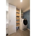 使いづらいスペースをなくし、白で統一された清潔な空間にかわいいクロスで日常を楽しくなる洗面。 白基調の洗面化粧台は、上から水を出せる「キレイアップ水栓」で水がたまらず水はねも抑えて、お手入れ簡単で温度調整も簡単。3面鏡はキャビネットとなっており、引き出し型の収納もあって収納力も兼ね備えています。 使うシーンを考えた結果、「見せる」と「隠す」の組み合わせた収納。すぐに取り出したいタオルや洗濯道具などはオープンな棚に、洗剤などのストックや掃除道具などは扉の付いた棚に片付け、すっきり片付き、スムーズに使えます。 ネイビー柄のクロスはサンゲツのムーミンシリーズで、近づくとムーミンと仲間たちがあたたかなタッチで描かれて、家事のひと時をちょっと楽しく。