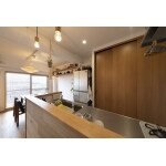 キッチンは、お⼦様たちの様⼦を⾒られるように対⾯キッチ ンにし、カウンターは⽊⽬をふんだんに使い、ナチュラルな 雰囲気に仕上げました。
