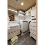 洗面台の向きを変え、スペースの使い方を見直した洗面。 同じスペースでも配置や向きによって、使いやすさは格段に変わってきます。 洗面台や造作棚などを白色で統一されて、清潔感あふれる空間になっています。 天井には木目の美しいクロスを貼り、ナチュラルな優しい印象に。 洗面収納をフルスライドタイプにすることにより、奥まで収納に使え、かつ小さなものも片付けやすく、造作棚も作り、頻繁に使うものをすぐに取り出せるようにすることで家事も日常生活もスムーズに。