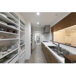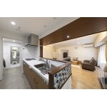 キッチンからリビング、ダイニングを⾒渡せるようになっ た。 基本オープンな収納で⼩さな⼦供達も⾃分で⽚付けられるよ うになった。 タイルや木目調の天井とカウンターが印象的で、背面の大型収納やフロアタイル、洗面へとつながる間取りで家事動線もスムーズなキッチンに。