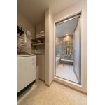ゆっくり一日の疲れを癒すために、広さと機能、生活動線にこだわったお風呂。 「広いお風呂でゆっくり疲れを癒したい」というご希望から、スペースを拡大しました。 合わせて入浴から就寝までの流れをスムーズにするため、寝室と同じ階にお風呂を移動しました。 洗面室とウォークインクローゼットを隣接することで、お風呂に入る前に他の部屋に衣服やタオルを取りに行く必要もなく、お風呂上がりのスキンケアなどもそのままの流れで出来、寝るまでの流れがスムーズに。 ヒヤッとせずやわらかく清潔や床をはじめ、保温性の優れた浴槽、節水を叶えつつ適度な浴び心地も両立したシャワーなど、清潔性と快適性にも優れています。 浴室乾燥も設置しているので、洗濯物が乾きにくい日にはお洗濯ものを干したりと家事楽にも。