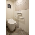 タンクレスにして空間を広く使えるようにし、手すりも設けて限られた空間でも動きやすくなったトイレ。 アクセントになるクッションフロアと、空気もきれいにするエコカラットが印象的です。 3枚連動の上吊りの引き戸にすることで、限られたスペースでも間口は広く、少しの力でも開けやすくフラットに出入りができるトイレです。