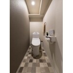 狭いトイレによく使われている隅付きタンクタイプのトイレから、清潔性、節水性にも優れたTOTOのGG800に。 タイル柄のクッションフロアとアクセントクロスで、おしゃれなトイレ空間に。