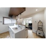 閉塞感のある独立型キッチンをリビングダイニングの隣に移動し、つながった対面キッチンは白を基調としたブルックリンスタイルのカフェ風キッチンになりました。 大きな間取り変更が難しい2×4工法のおうちでしたが、キッチンを移動して理想の生活に合った間取りに変身、つながり使いやすい空間になりました。 カウンターと同じ木目調のものにした下げ天井は、対面式キッチンにレンジフードを取り付けられ、おしゃれなカフェを思わせます。 落ち着いた色合いの木目が素敵なキッチンカウンターは4人でもゆったり。窓から光も差し込み、忙しい朝でもさわやかな空間でお食事を楽しめます。その窓はお庭のウッドデッキにもつながり、お友達を呼んでBBQなどを楽しむときにここからお食事を出したりも。 ネイビーオークとチェックガラスが印象的な引き戸は、白基調の部屋のアクセントになり、動線を塞がずスムーズに。