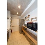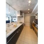 壁を取り払い、リビングダイニングにいる家族と会話を楽しんだり、小さなお子様を見ながらお料理ができるようになったオープンなキッチン。床材をリビングダイニングと変えることでつながりながらも、しっかりと分けられた空間に。水や油などの汚れがついても掃除しやすいフロアタイルを貼りました。