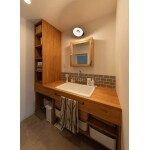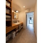 ・回遊家事動線 ・使いやすい洗面所(実験台シンクの造作洗面化粧台) ・奥様こだわりのクロスアクセントやセレクトされた照明が全て北欧テイストでまとめられている。