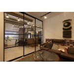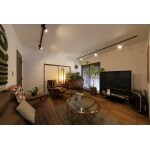 ・キッチンをオープンにして壁、床にタイルを施⼯。 ・ダイニング空間の天井を上げて、⾒せ梁を施⼯。 ・ダイニングとキッチン間に透明のパーテーションを施⼯。
