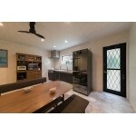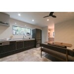 シンプルに白と黒でまとめた空間に、リアルな石の模様のヘキサゴンタイルが、大人の上品さを感じさせるダイニングキッチン。 廊下を取り込むことで空間を広く使えて、新たに設けたパントリーにもアクセスしやすくなり、一緒に住む家族が増えても、狭さも不便さも感じることのない家族にフィットした空間になりました。 システムキッチンや家電を黒で揃えたシックなキッチン。正面の大きな横長窓からは、お料理中やお食事中にお庭の景色も楽しめ、季節の移ろいも感じることができます。 たっぷりの収納力を備えたパントリーは、サブウェイタイルのクロスやおしゃれなペンダントライトをあしらい、ただの収納ではなくお気に入りの空間になるように。