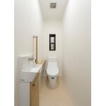 ひんやりしたタイル式の在来のトイレから、最新トイレや手すりを設けた安全で便利なトイレになりました。2世帯住宅の1Fのトイレは、主に使われるご両親世帯はもちろん、小さなお子様にとっても安全で清潔なトイレになっています。 コンパクトな手洗いは収納も備えて、限られた空間を上手に使って狭さを感じさせません。 カウンターは手すりにもなりますし、ちょっとしたものを置いておくのにも便利です。