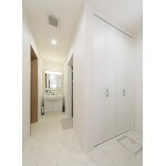 廊下を取り込んでスペースが広くなり、キッチンとも直接つながることで家事動線もスムーズになった洗面。お風呂を囲むように位置する洗面スペースは、大型のクローゼットを設けてユーティリティの役割を大きく担い、家事ラクを実現しました。 大型収納には洗濯洗剤や日用品からタオルなどの入浴に使うものまで、スッキリ片づけられます。脱衣所も兼ねている洗面なので、収納棚から道具を出し、入浴、着替えて、脱衣物は洗濯機へと一か所で完結でき、洗濯などの家事もスムーズにしました。
