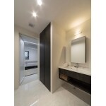 1階洗面所はシックなカラーリングで大人モダン