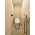 トイレの奥行きの圧迫間を軽減するためタンクレストイレを採用し、アクセントクロスを目立たせる空間にしました。
