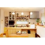 ペンダントライトが印象的なあたたかみのあるキッチンスペース。 見せる棚収納で実用的かつデイスプレイを楽しめます。 格子や対面カウンターで空間を仕切りながらも、 コミュニケーションがとりやすい家族の為の空間になった。